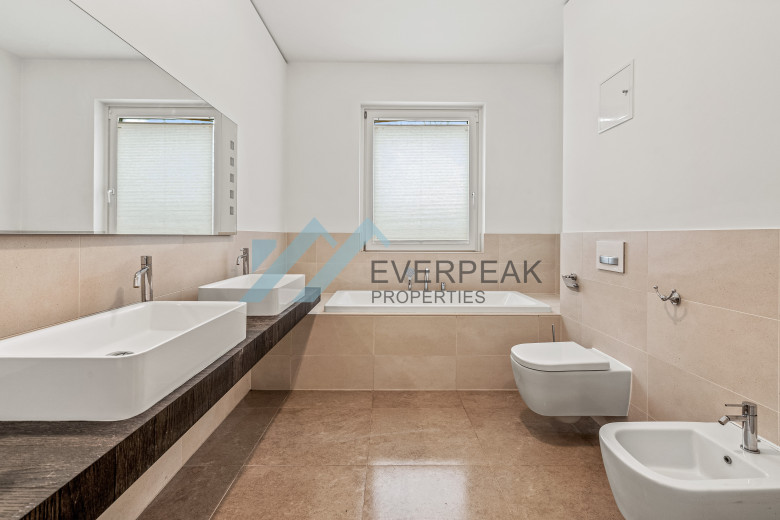 Der Masterbereich wirkt wie eine private Suite: ein ruhiges Schlafzimmer mit Blick ins Grüne und ein großzügiges Ensuite-Badezimmer mit Badewanne, bodentiefer Dusche, Doppelwaschtisch und sorgfältig ausgewählten Materialien.