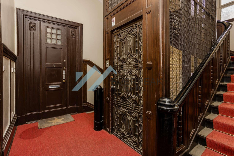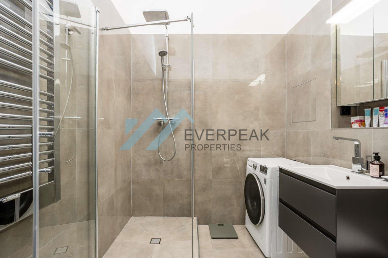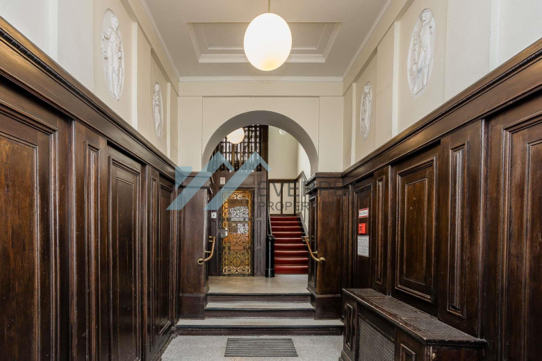 Das stilvolle Badezimmer beeindruckt mit einer bodentiefen Dusche und eleganten Armaturen. Der unverwechselbare Altbaucharakter zieht sich durch das gesamte Haus und wird durch den historischen Personenaufzug unterstrichen, der Sie bequem in die dritte Etage bringt.
